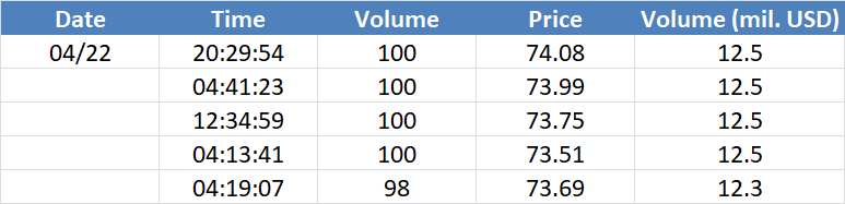 A legnagyobb volumenű tranzakciók az OIL (Brent) instrumentumon: