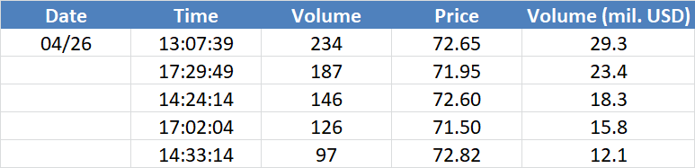 A legnagyobb volumenű tranzakciók az OIL (Brent) instrumentumon: