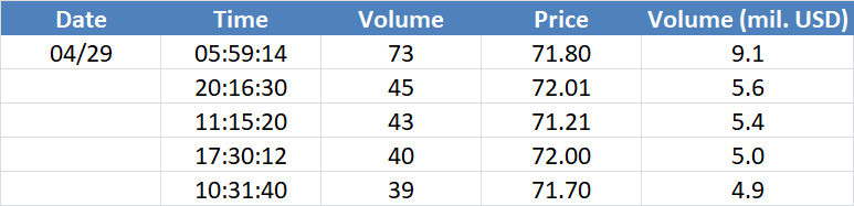 A legnagyobb volumenű tranzakciók az OIL (Brent) instrumentumon:
