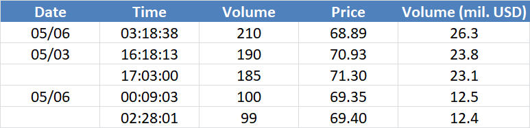 A legnagyobb volumenű tranzakciók az OIL (Brent) instrumentumon:
