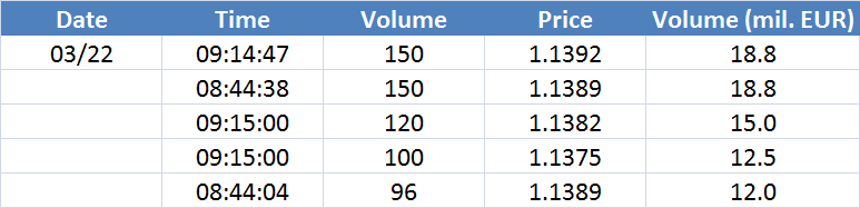 - legtöbb tranzakció az 1.1303 árszinten történt