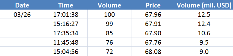A legnagyobb volumenű tranzakciók az OIL (Brent) instrumentumon: