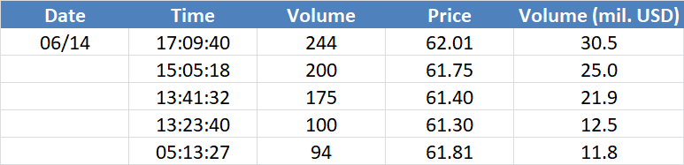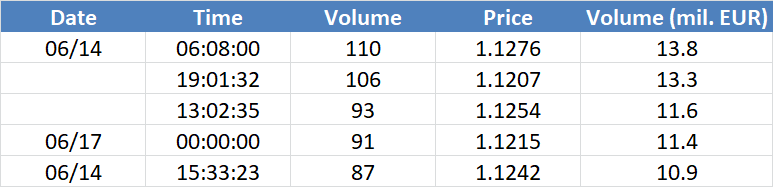 A legnagyobb volumenű tranzakciók az OIL (Brent) instrumentumon: