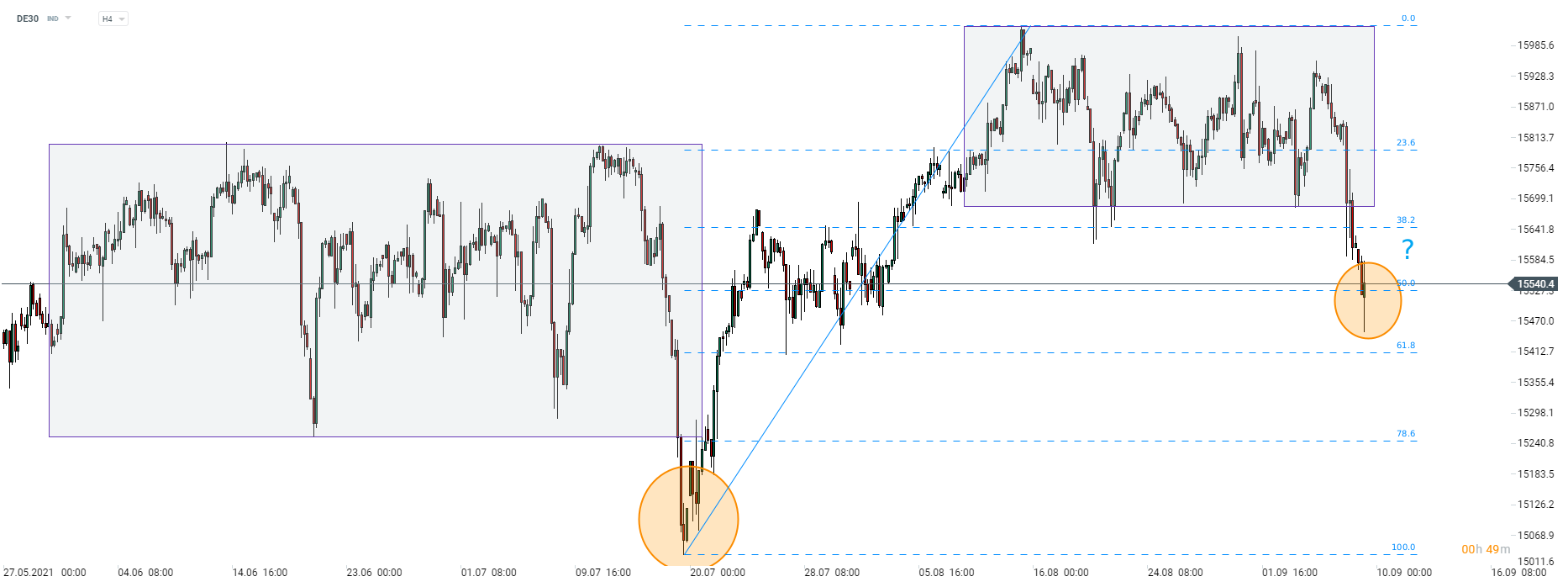Mivel a piacok figyelembe veszik az EKB mai jelentős lépésének lehetőségét, a döntés valóban hatással lehet a piacokra, különösen a DE30-ra és az euróra. Ami a német indexet illeti, a DE30 a közelmúltbeli konszolidáció tartománya alá esett, és nagy csökkenéssel fenyeget, ami trendfordulót eredményezhet. Megjegyzendő azonban, hogy a június-júliusi kereskedési tartományból való korábbi, ilyen lefelé irányuló kitörés hamisnak bizonyult, és az index később új történelmi csúcsra emelkedett. A folyamatban lévő visszaesés ma megállt a július közepén indult felfelé irányuló impulzus 50%-os retracementjénél. Vajon a mai EKB-döntés kiváltja-e a 2021 végihez hasonló fellendülési mozdulatot? Délután kiderül, de a részvények számára fájdalmas lehet, ha az EKB úgy dönt, hogy csökkenti az eszközvásárlásokat.