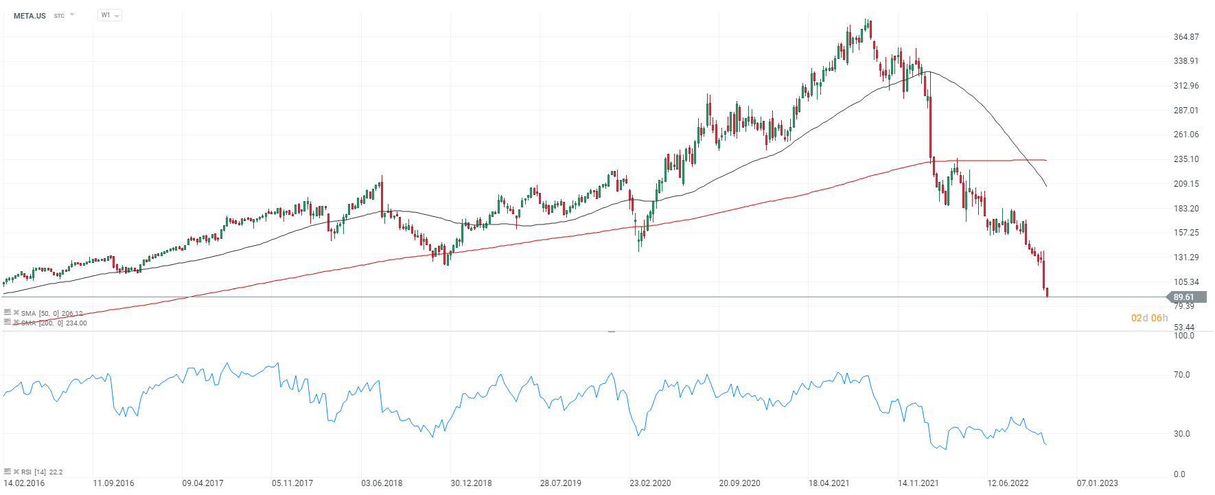 A hawkish Jerome Powell and an interest rate hike-focused central bank in the U.S. is a highly unfavorable environment for investment in new technologies. Rising rates mean rising financing costs. In addition, slowing economic activity is causing advertisers to cut back on ad spending, which is hurting Meta, whose main source of revenue is still Facebook and Instagram. The market seems to doubt the success of Mark Zuckberg's futuristic, dangerous visions and fears the possible effects of the company's failure.