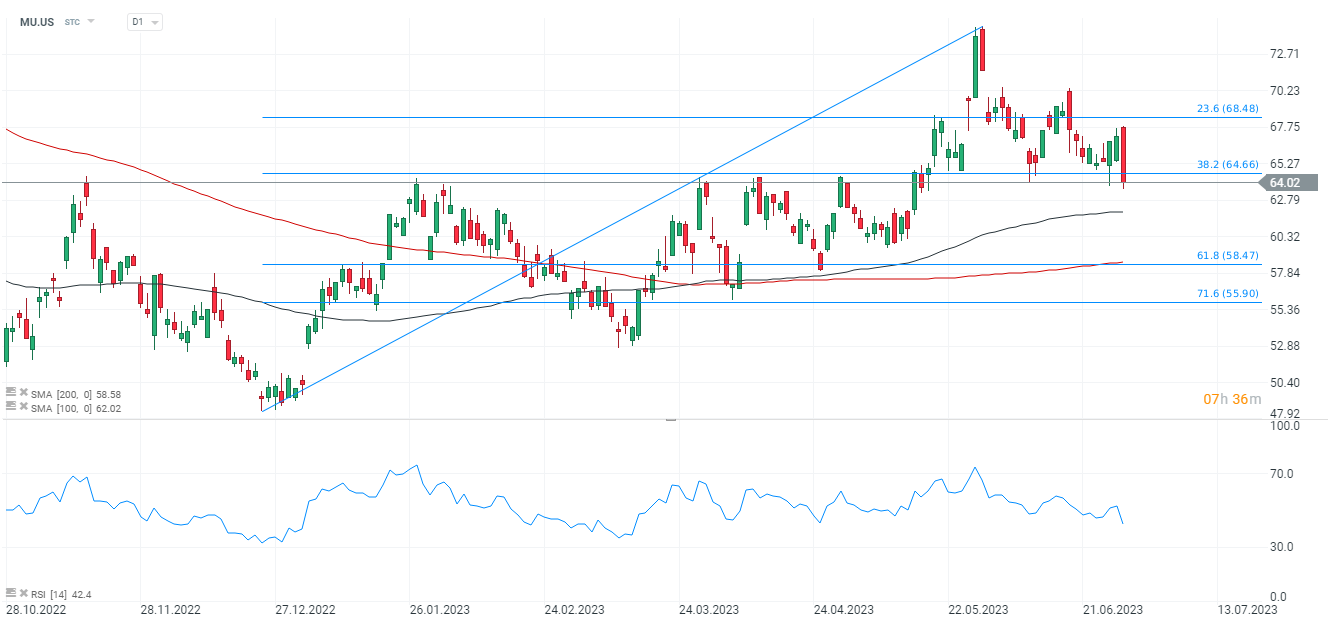Micron (MU.US) shares D1 interval. The stock is in an uptrend, but a drop below the 38.2 Fibonacci retracement of the upward wave from December puts a question mark over a potential test of $58 per share, where we see 61.8 Fibo retracement and previous price reactions. Source: xStation5