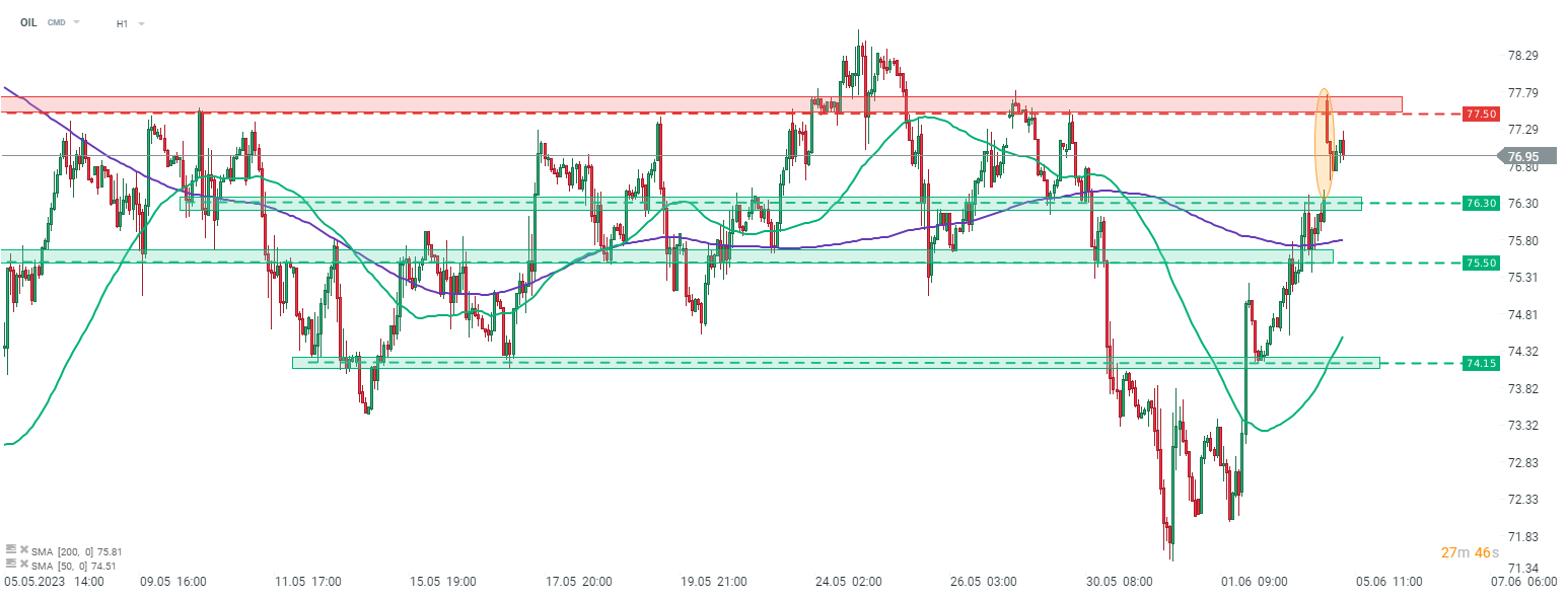 Brent (OIL) launched new week with a bullish price gap and tested $77.50 area. Move was triggered by Saudi Arabia announcing a 1.5 million barrel output cut for July. However, the majority of gains have been erased already. Source: xStation5
