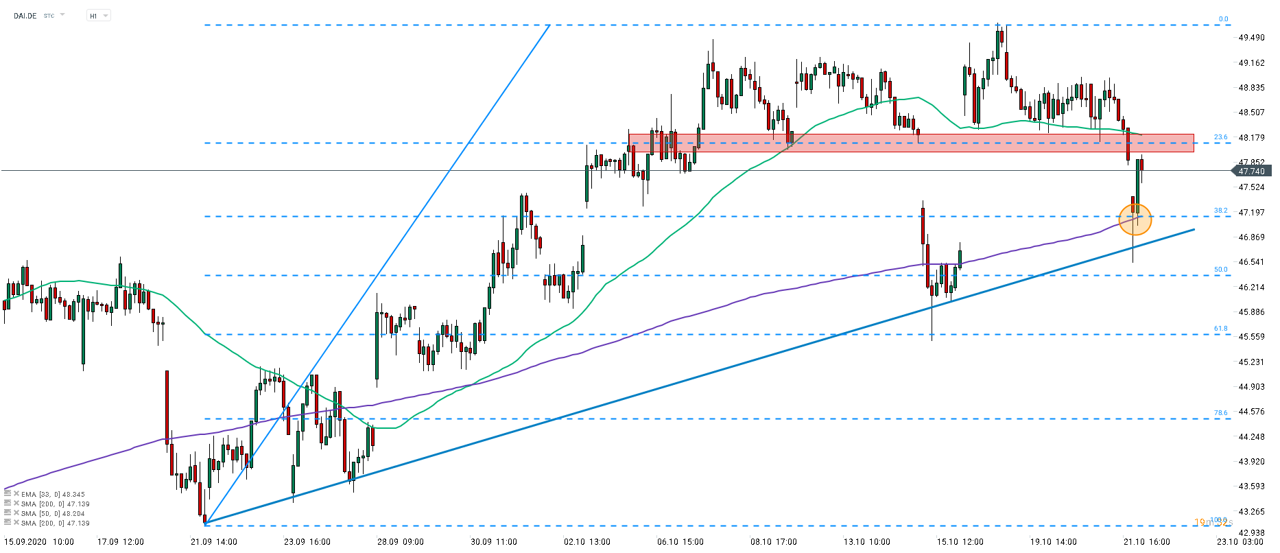 A Daimler (DAI.DE) leesett a legutóbbi emelkedés 23,6%-os visszatérési szintje alá. A részvény esését a 200 órás mozgóátlag (lila vonal) és a 38,2%-os visszatérési szint állította meg. Ezután egy erős pozitív korrekció indult, de az árfolyam nem tudta átlépni a korábban említett 23,6%-os visszatérési szintet. Forrás: xStation5