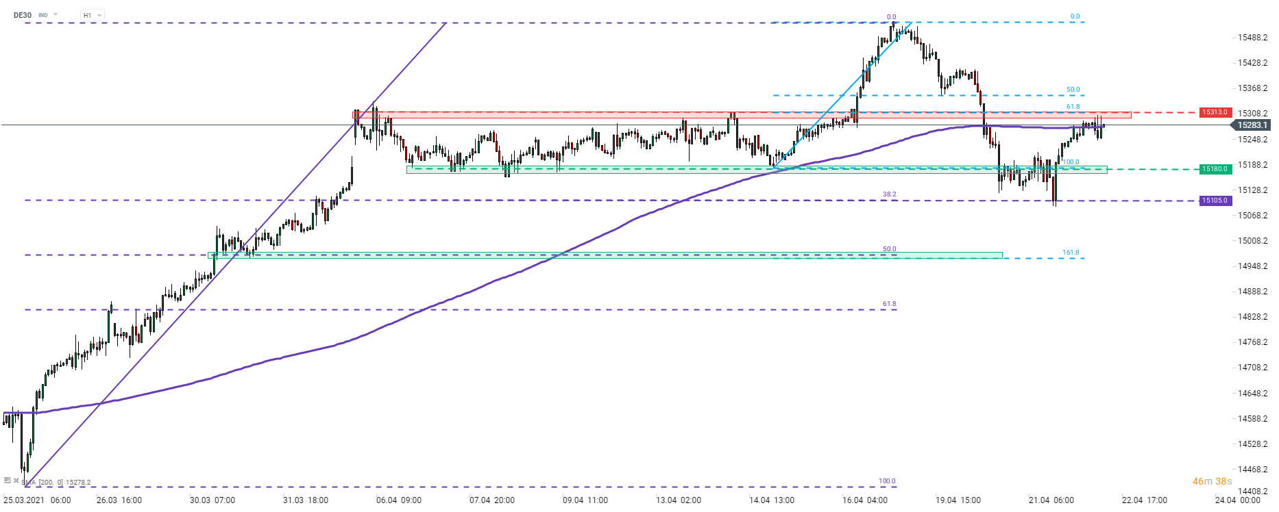 A DAX (DE30) esését tegnap sikerült megállítani a 2021 március végén indult emelkedő szakasz 38,2%-os visszatérési szintjénél (15.105 pont), ahonnan az index megkezdte a felépülést. Az emelkedés ma reggel a 200 órás mozgóátlagnál akadt meg (lila vonal) és picit e felett található a 15.300 pontos szint és az április 14-én indult emelkedő szakasz 61,8%-os visszatérési szintje (15.313 pont) által alkotott ellenállási zóna is.