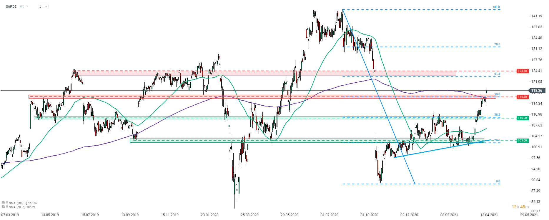 Az SAP (SAP.DE) részvényei felfelé ugrottak ma az előzetes eredmények megerősítésére. Az árfolyam ma egy fontos ellenállási zóna felett nyitott (116,50 euró), amit a 200 napos mozgóátlag (lila vonal) és a 2020 szeptember-októberi esés 50%-os visszatérési szintje alkot. A következő figyelendő ellenállás 124,50 euró és a 61,8%-os visszatérési szint között található. Forrás: xStation5