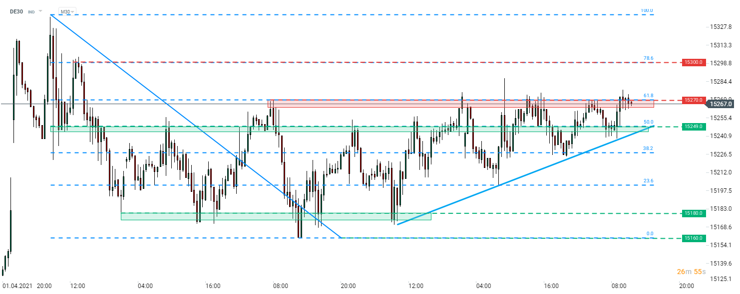 A DAX (DE30) jelenleg a múlt heti korrekció 61,8%-os visszatérési szintjét teszteli 15.270 pontnál, és ez a zóna alkotja a rövidtávú emelkedő háromszög felső határát is. Az ár ilyen alakzat esetén inkább felfelé szokott kitörni a mintából, és ha most is így történne, akkor a következő rövidtávú ellenállást a 78,6%-os visszatérési szintnél érdemes figyelni (15.300 pont). A legközelebbi támasz az 50%-os visszatérési szintnél, 15.250 ponton található.