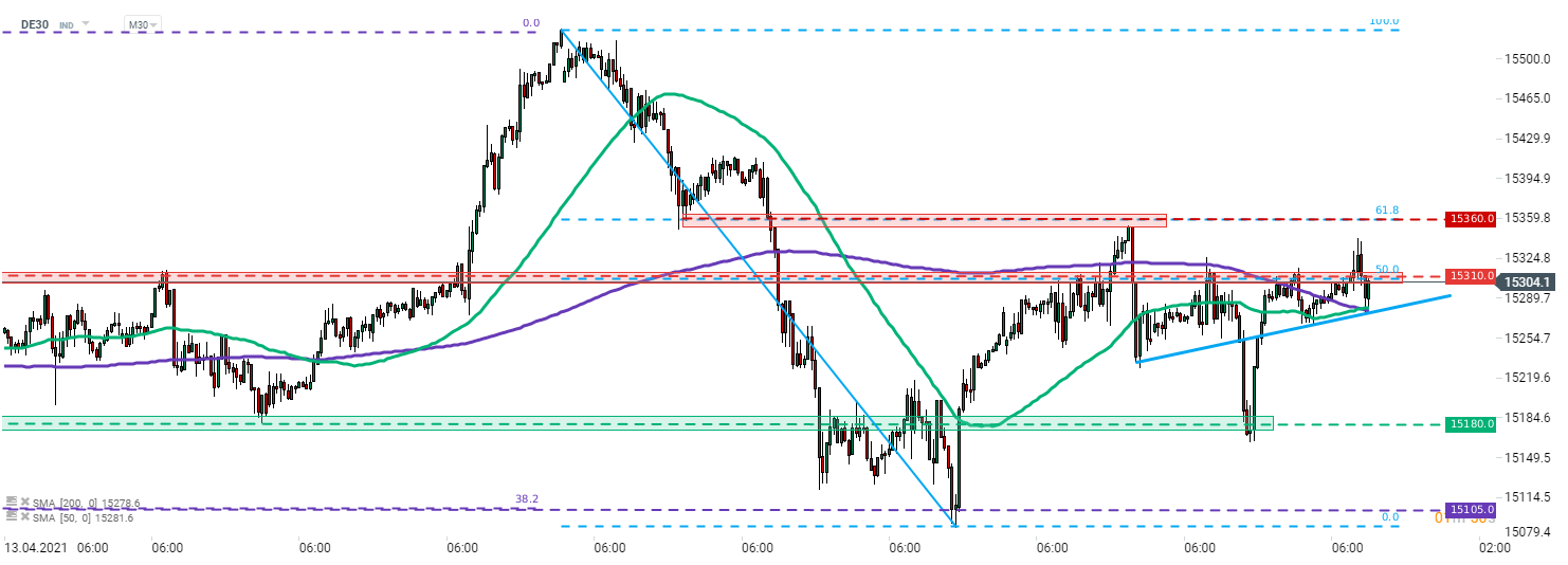 DE30 continues to struggle to hold above the 15,310 pts price zone. Index broke above this zone this morning but has pulled back below later on. Pullback was halted at the 50- and 200-period moving average (M30 interval) and now the index is trying to break above the 15,310 pts zone once again. Should DE30 break above it, the next target for bulls can be found at 15,360 pts, where the 61.8% Fibonacci retracement of a recent correction is located.