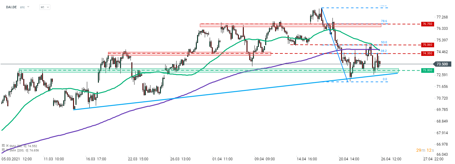 Daimler (DAI.DE) dropped over 7% off a recent post-pandemic high. However, pullback was halted at the short-term upward trendline. Key near-term resistance levels to watch are €74.35 (38.2% retracement) and €75.06 (50% retracement). Stock failed to break above those levels and now is heading towards support at €73. Source: xStation5