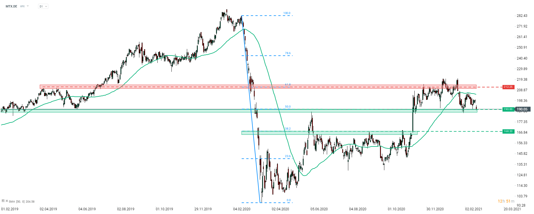 Annak ellenére, hogy tisztességes eredményszámokat közölt a cég, az MTU Aero (MTX.DE) részvényei alacsonyabban forognak a mai napon. A befektetők csalódottnak tűnnek a 2021-re megfogalmazott várakozásokkal kapcsolatban, így a részvény a február-márciusi esés 50%-os visszatérési szintjét teszteli 190 eurónál. Ha letörne ez a támasz, megnyílna az út a tavaly június és november között látott kereskedési sáv tetejéig 168,20 eurónál, ami egyben a 38,2%-os visszatérési szint is. Forrás: xStation5