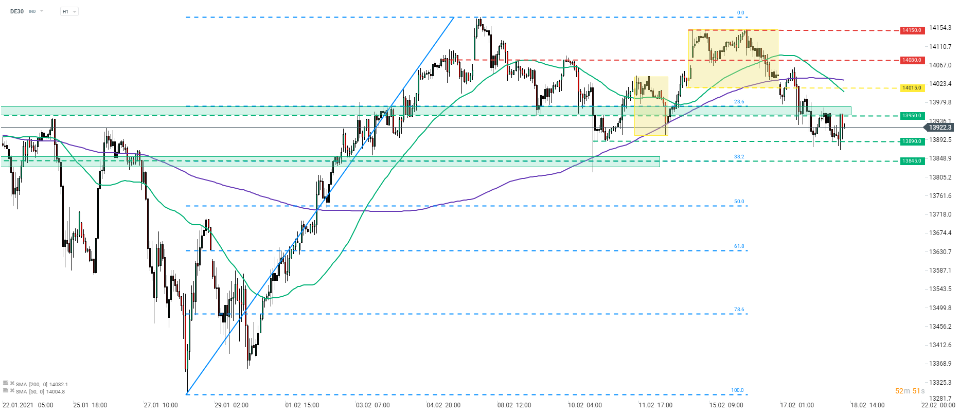 Ha a felső határt sikerülne áttörni, akkor az index a 14.035 pontos szintig ugorhat, amit a február 11-én és 12-én beállított lokális csúcsok és a 200 órás mozgóátlag (lila vonal) határoznak meg. Másrészről, ha az index 13.890 pont alá esne, az megnyitná az utat a január végén megindult emelkedés 38,2%-os visszatérési szintjének teszteléséhez (13.845 pontnál). A ma publikálandó EKB jegyzőkönyv várhatóan nem tartalmaz majd meglepetéseket és valószínűleg nem lesz hatással a piacokra.