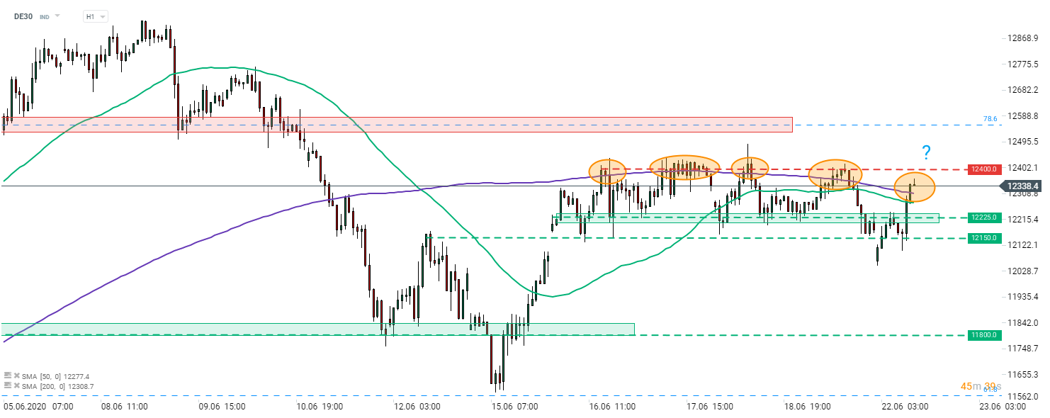 A DAX (DE30) az amerikai határidős indexekhez hasonlóan alacsonyabban kezdte a hetet, de a délelőtti kereskedés során egy erős, felfelé tartó mozgás indult el, amellyel az index a 200 órás mozgóátlagot is áttörte (lila vonal) - ez az ellenállás az utóbbi időben rendre megállította az emelkedéseket (narancssárga körök). Az index ebben a hónapban már bemutatott néhány fals kitörést ezen a szinten, így a ma délelőtti kiugrást sem lehet biztosra venni. A 12.400 pont feletti napi zárás megerősítené a kitörést és felbátorítaná a vevőket a további akciókra. E forgatókönyv esetén a 78,6%-os visszatérési szint lehet a következő figyelendő 12.550 pont körül.
