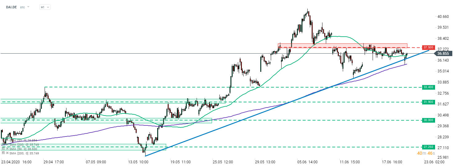 A Daimler (DAI.DE) beesett a mai kereskedés kezdetén, de a 200 órás mozgóátlag tesztelése után megkezdte a felépülést. A részvény most az utóbbi napok kereskedési sávjának (36.50-37.50 euró) alját támadja, ennek áttörése esetén megnyílna az út a 37,50 eurós szint támadásához. Forrás: xStation5
