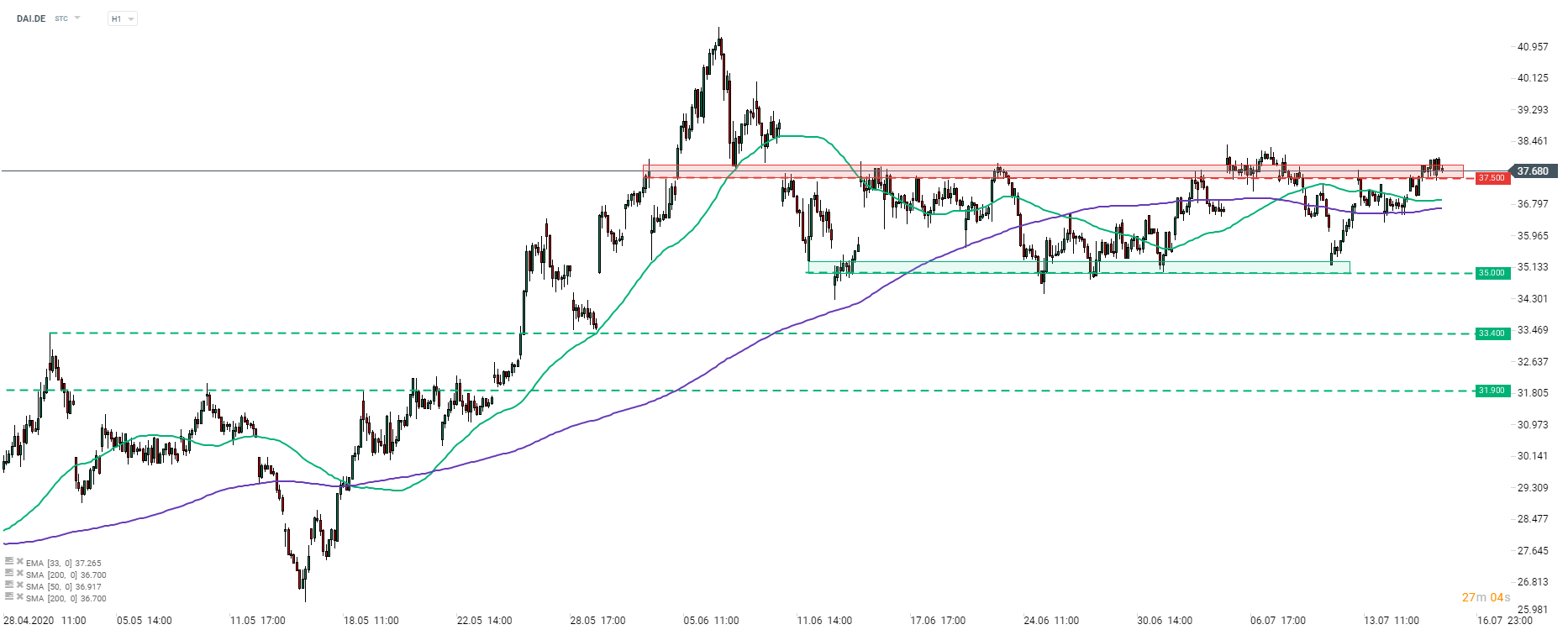 A Daimler (DAI.DE) tegnap elérte az utóbbi időszakban jellemző kereskedési sávjának tetejét. A részvény küzd ennek áttörésével, és növekszik egy visszahúzás esélye. Ilyen forgatókönyv esetén a kereskedési sáv alja lehet az első célszint 35 eurónál. Forrás: xStation5