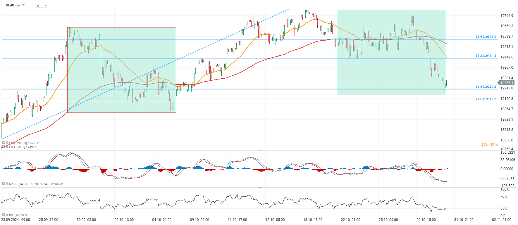 A DAX (DE40) jegyzése a jelek szerint 1:1 korrekciós forgatókönyvet követ, és ha ennek feltételei teljesülnek, akkor nem kizárt a 19700 pontig való visszapattanás sem. Az index visszapattanással reagált, miután elérte a 61,8-as Fibonacci retracementet 19200 pontnál.