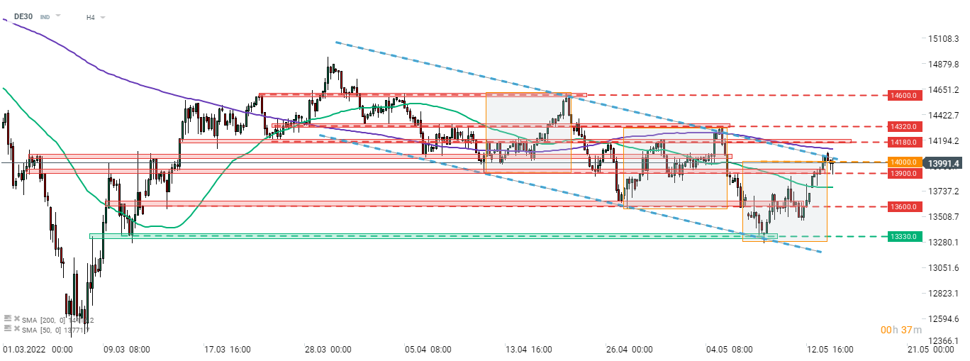 Enyhe mínuszban forog hétfőn délelőtt a DE30, az index a lélektanilag fontos 14 ezres szint áttörésével küzd. Érdemes megjegyezni, hogy az ereszkedő trendcsatorna felső határa és a lokális piaci geometria felső határa is ezen a területen található. Ennek áttörése javítaná a technikai képet és teret nyitna a 14.180 pontos ellenállás teszteléséhez. Forrás: xStation5