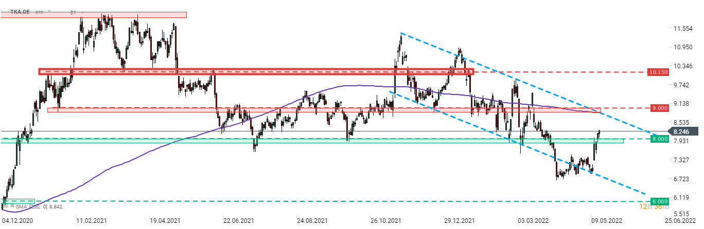A Thyssenkrupp (TKA.DE) magasabban forog a vezetőség felvásárlásokra vonatkozó optimista nyilatkozata után. A részvény múlt hét végén áttörte a 8 eurós ellenállást, ma pedig folytatja emelkedését. A legközelebbi ellenállási szint 9 euró alatt található, amit az ereszkedő trendcsatorna felső határa és a 200 napos mozgóátlag jelöl ki. Forrás: xStation5