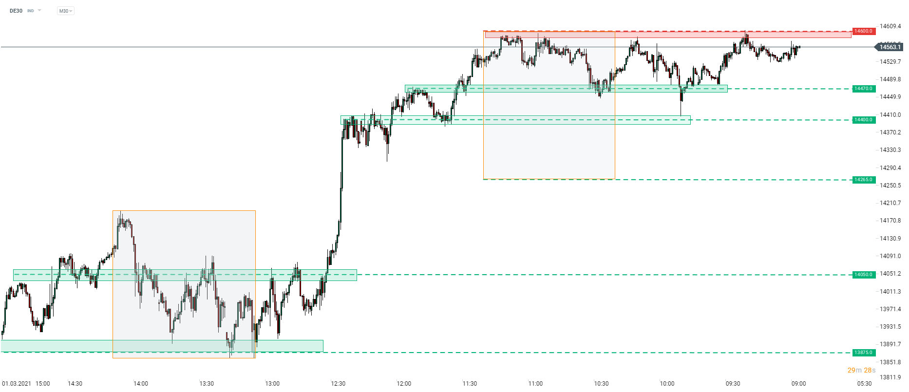 A DE30 ugyan magasabb mélypontot tudott rajzolni, de a 14.600 pont alatt lévő ellenállási zóna továbbra is megállítja az emelkedési próbálkozásokat. Amíg az árfolyam ez alatt az akadály alatt tartózkodik, a 14.470 pont és 14.600 pont közötti oldalazás tűnik a legvalószínűbb forgatókönyvnek. A kereskedők megemelkedett volatilitásra számíthatnak a Fed ma esti ülésének időpontja körül, amin a Fed közzéteszi legfrissebb kamatdöntését és új gazdasági előrejelzéseit.