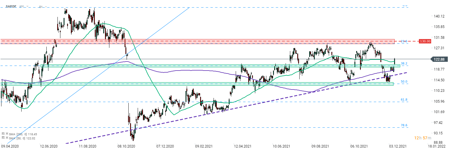 Az SAP (SAP.DE) ralizik ma, miután az UBS vételre javította ajánlását. Az árfolyam át tudta törni a járvány utáni emelkedés 38,2%-os visszatérési szintjét (120 eurós terület) és jelenleg 3 hetes csúcson forog. A következő főbb ellenállási zóna a 23,6%-os visszatérési szint felett, 130 euró környékén található. Forrás: xStation5