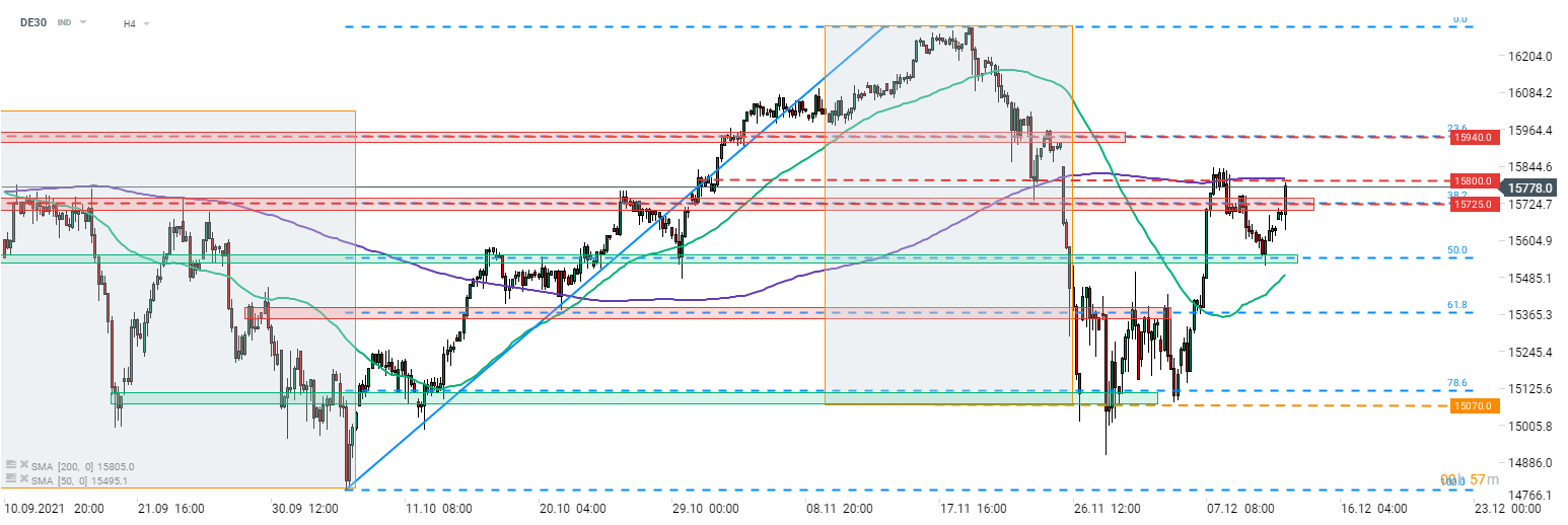 A német DE30 más európai indexekkel egyetemben erősödik hétfőn. A fő német tőzsdemutató felpattant az október-novemberi emelkedő szakasz 50%-os visszatérési szintjéről (15.725 pont körüli terület) az előző hét végén, ma pedig folytatódott az erősödés. Az árfolyam délelőtt tesztelte a 15.800 pontos szintet, de nem tudta azt áttörni. A DE30 reagál a fent említett visszatérési szintre, így amennyiben sikerülne áttörni a 200 periódusos mozgóátlagot (lila vonal, H4 intervallum), a bikák ezután a 15.940 pontos szintet figyelhetik.