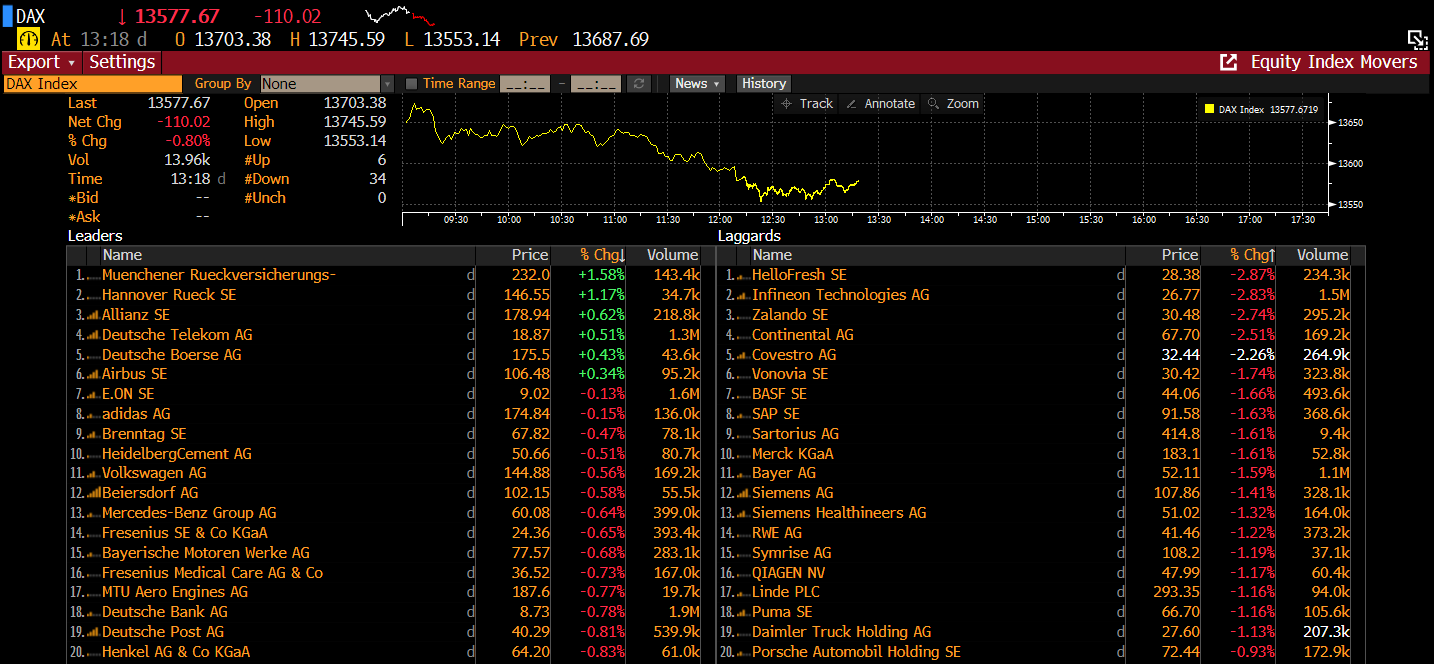 A DE30 indexben szereplő cégek legnagyobb százalékos változása. Forrás: Bloomberg