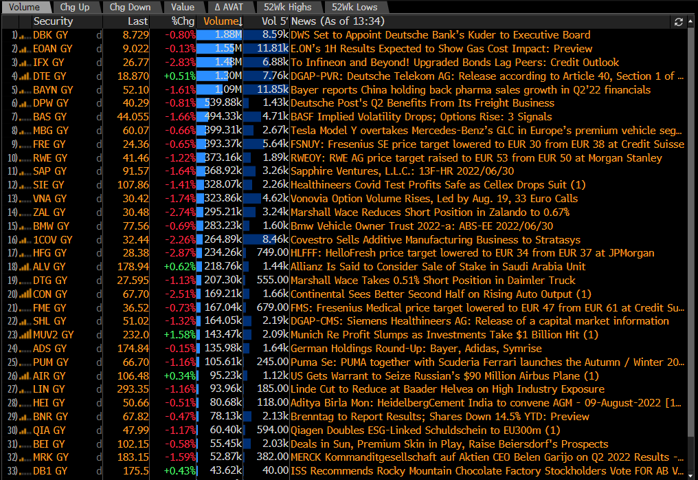 A DE30 index legaktívabb részvényei. Forrás: Bloomberg