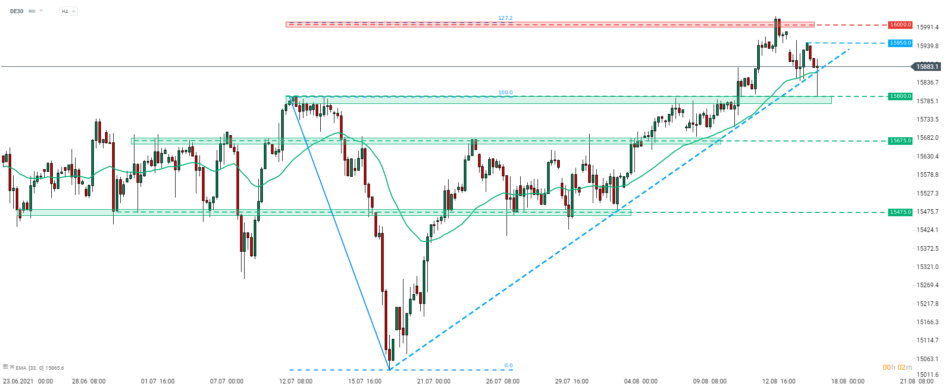 A legutóbbi lokális csúcs áttörése (15.950 pontnál) azt jelezné, hogy a korrekció a véget ér. Ilyen forgatókönyv esetén a rövidtávú ellenállást 16.000 pontnál érdemes figyelni, itt található a júliusi korrekció 127,2%-os külső visszatérési szintje. A 15.800 pont körüli zóna, ami a mai esést is megállította, továbbra is a rövidtávú kulcstámasz.