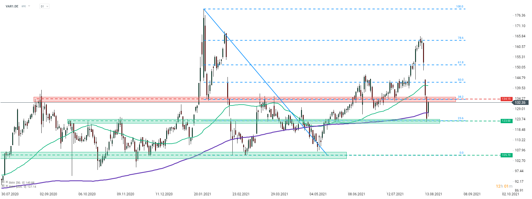 A Varta (VAR1.DE) árfolyama esésnek indult a hónap elején a kiábrándító első féléves eredménye publikálása után. A DZ Bank elemzői ugyanakkor javuló kilátásokat látnak a társaságnál, és úgy döntöttek, hogy javítják ajánlásukat. A részvény felpattant a 2021 január végén elindult eső szakasz 23,6%-os visszatérési szintjéről, és újra a 200 napos mozgóátlag (lila vonal) fölé tört. A rövidtávú ellenállási zóna a 38,2%-os visszatérési szintnél, 134,15 eurónál található. Forrás: xStation5