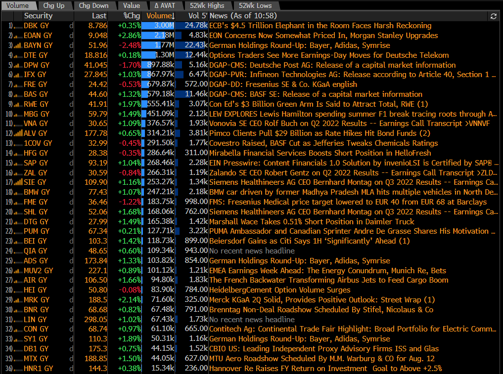 A DE30 index legaktívabb részvényei. Forrás: Bloomberg