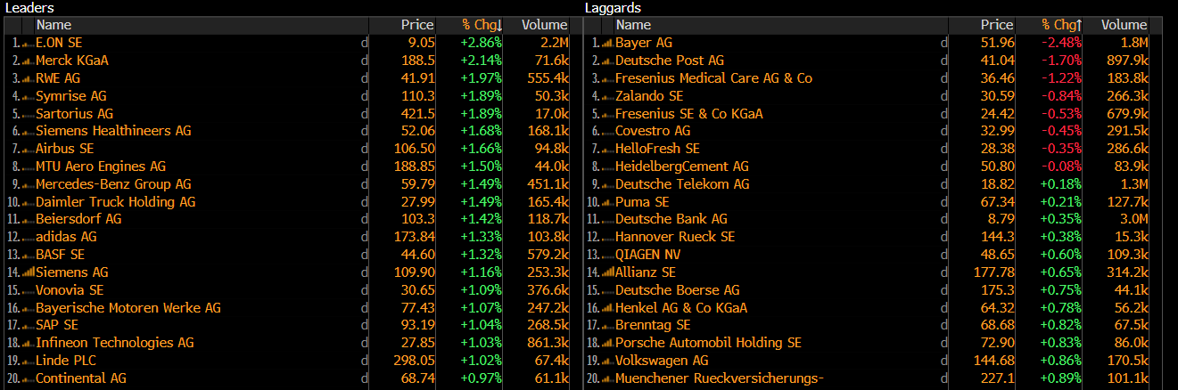 A legnagyobb százalékos változás a DE30 indexben szereplő cégek esetében. Forrás: Bloomberg