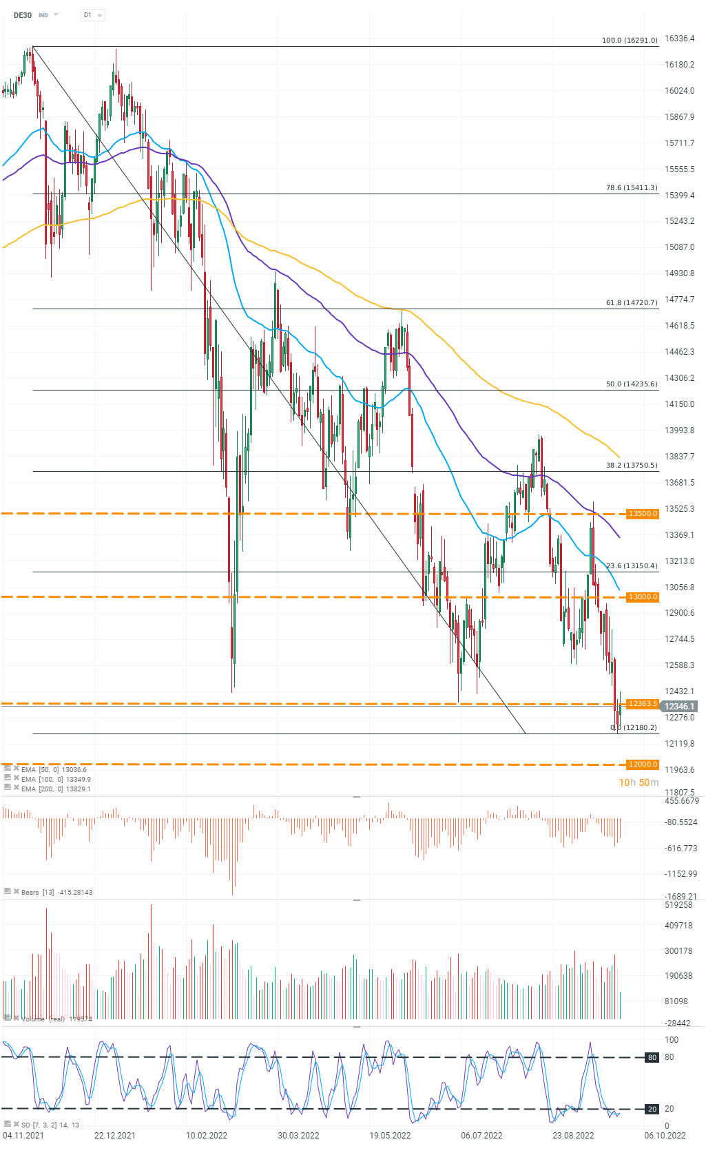 A DE30 index ma a múlt héten beállított idei mélypontja és a 12.360 pontos ellenállási szint között ingadozik. Forrás: xStation5