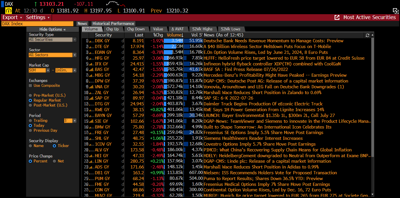 A DE30 index legaktívabb részvényei. Forrás: Bloomberg