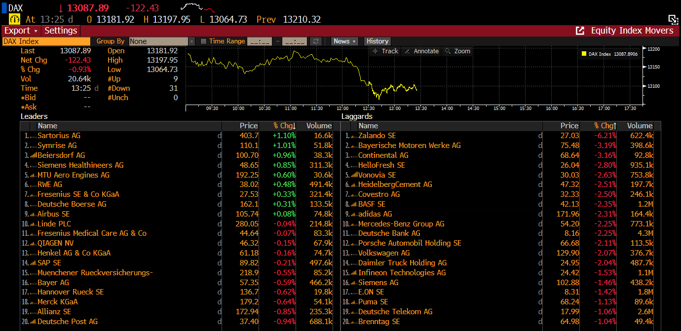 A DE30 indexben szereplő cégek legnagyobb százalékos változása. Forrás: Bloomberg