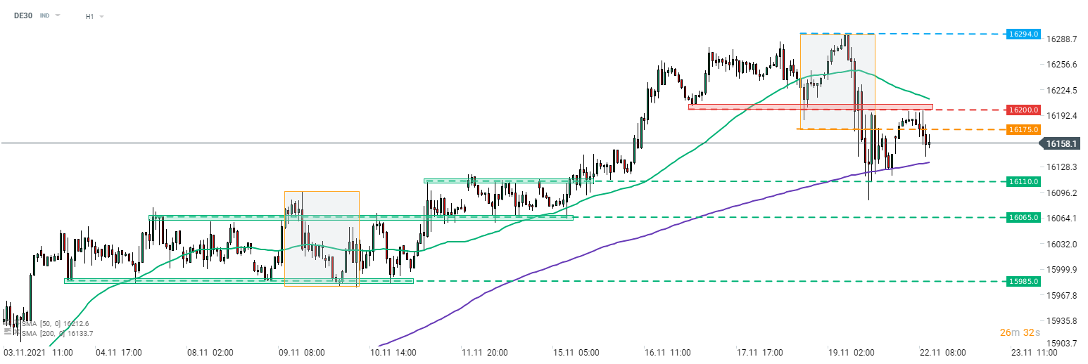 A német határidős index, a DE30 magasabban nyitott a hétvége után, de az emelkedést megállította a 16.200 pontos ellenállási zóna. A DE30 múlt hét végén a lokális piaci geometria alá tört, ami egy nagyobb esés esélyével fenyeget. A kulcstámaszt most a 200 órás mozgóátlag jelenti (lila vonal), ami megállította a pénteki eladási hullámot. Forrás: xStation5