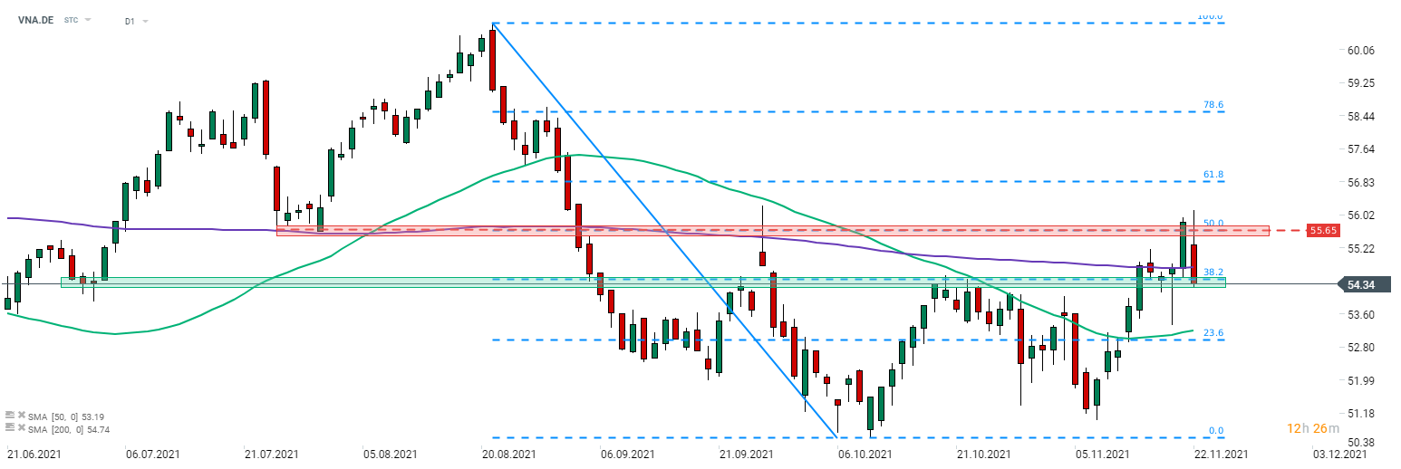 A Vonovia (VNA.DE) részvényei 2% feletti esést mutatnak ma a tervezett tőkeemelés és részvénykibocsátás hírére. A papír a pénteki napot valamivel az 55,65%-os ellenállási zóna felett fejezte be, amit a legutóbbi korrekció 50%-os visszatérési szintje jelöl - a részvény ma erről az ellenállásról húzódott vissza és most a 38,2%-os visszatérési szint által jelölt támaszt teszteli 54,50 eurónál. Forrás: xStation5