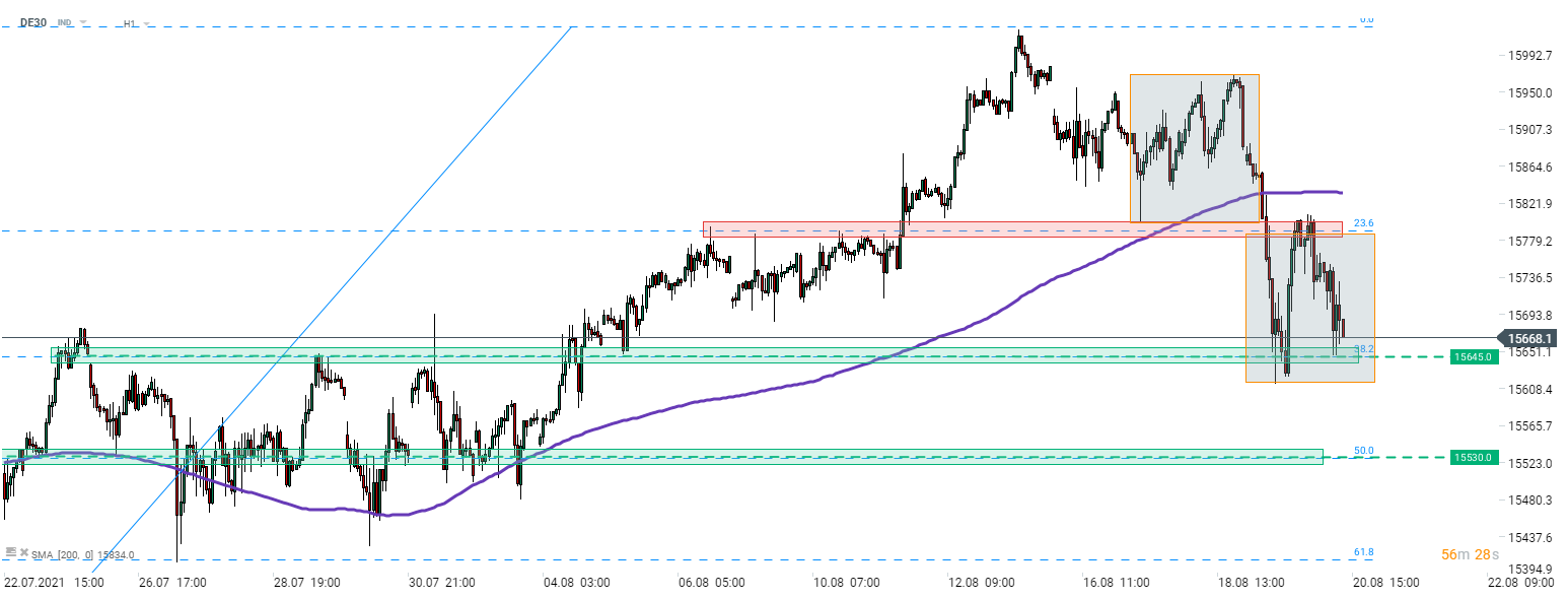 A DE30 tegnap nem tudott visszatérni a július közepén indult emelkedő szakasz 23,6%-os visszatérési szintje alkotta ellenállási zónán 15.800 pont környékén és ez a szint többé-kevésbé a piaci geometria felső határával is egybeesik. Az index innen újra lefordult és tesztelte a 15.645 pontos támaszzónát, amit a 38,2%-os visszatérési szint jelöl. Ha az index ezt is áttöri lefelé, és alacsonyabb mélypontra jut, akkor megnyílik az út az 50%-os visszatérési szint felé, 15.530 pontnál.