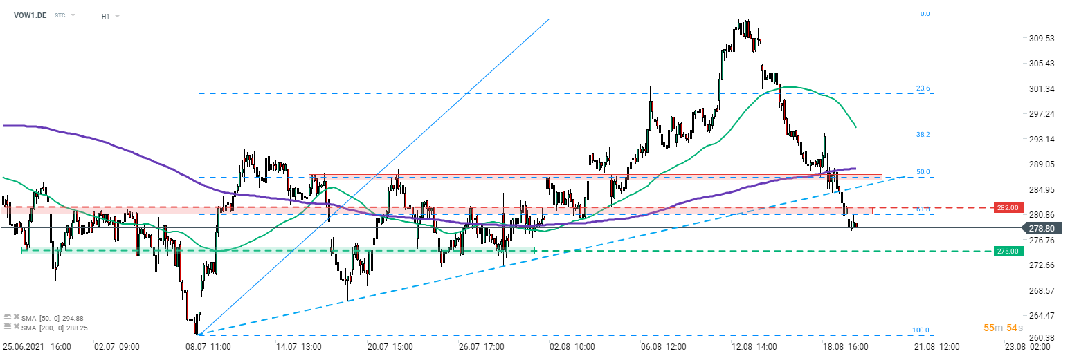 A (VOW1.DE) részvényei tovább estek ma, az árfolyam lefelé áttörte a 2021 júliusában indult emelkedő szakasz 61,8%-os visszatérési szintjét. A reggeli csökkenés után a vevők egyelőre meg tudták állítani az esést a 280 eurós szint környékén, jelenleg valamivel 280 euró alatt ingadozik az árfolyam. Ha nem sikerülne visszatérni 280 euró fölé, akkor a részvények tovább eshetnek a 275 eurós támaszig.