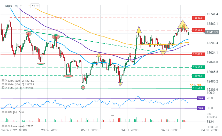 Esik ma a német blue chip mutató és ezzel újra a tegnap áttört 13.450 pontos szint alá került. Technikai szemszögből nézve ez így egy fals kitörés volt, és újra előkerültek az exponenciális mozgóátlagok (kék, lila és aranysárga vonalak), mint legközelebbi támaszok. Lényeges támasz még a kerek 13 ezer pontos szint, a legfontosabb ellenállás pedig még mindig az említett 13,450 pont. Forrás: xStation5