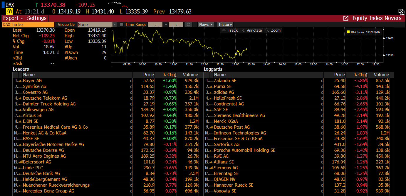 A DE30 indexben szereplő vállalatok legnagyobb százalékos változásai. Forrás: Bloomberg