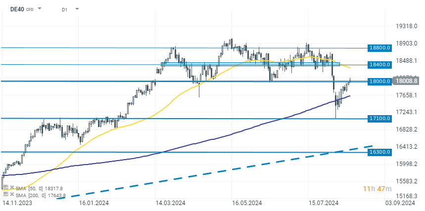 A DAX ma 0,25%-os emelkedést mutat, és a 18 000 pontos szintet teszteli. Ez egy kulcsfontosságú zóna, amely a közelmúltban a bikák számára támaszként szolgált a konszolidációs csatornán belül. Ez a szint egybeesik a közelmúltbeli lefelé irányuló mozgás 61,8%-os Fibonacci-retracementjével is. Ezért egy tartós áttörés semmissé tenné a közelmúltbeli csökkenést. Ha a bikáknak sikerül e szint fölé emelkedniük, a következő figyelemre méltó terület 18.400 pont körül van. Ellenkező esetben a legközelebbi támasz a 200-as SMA 17.650 pont körül található.