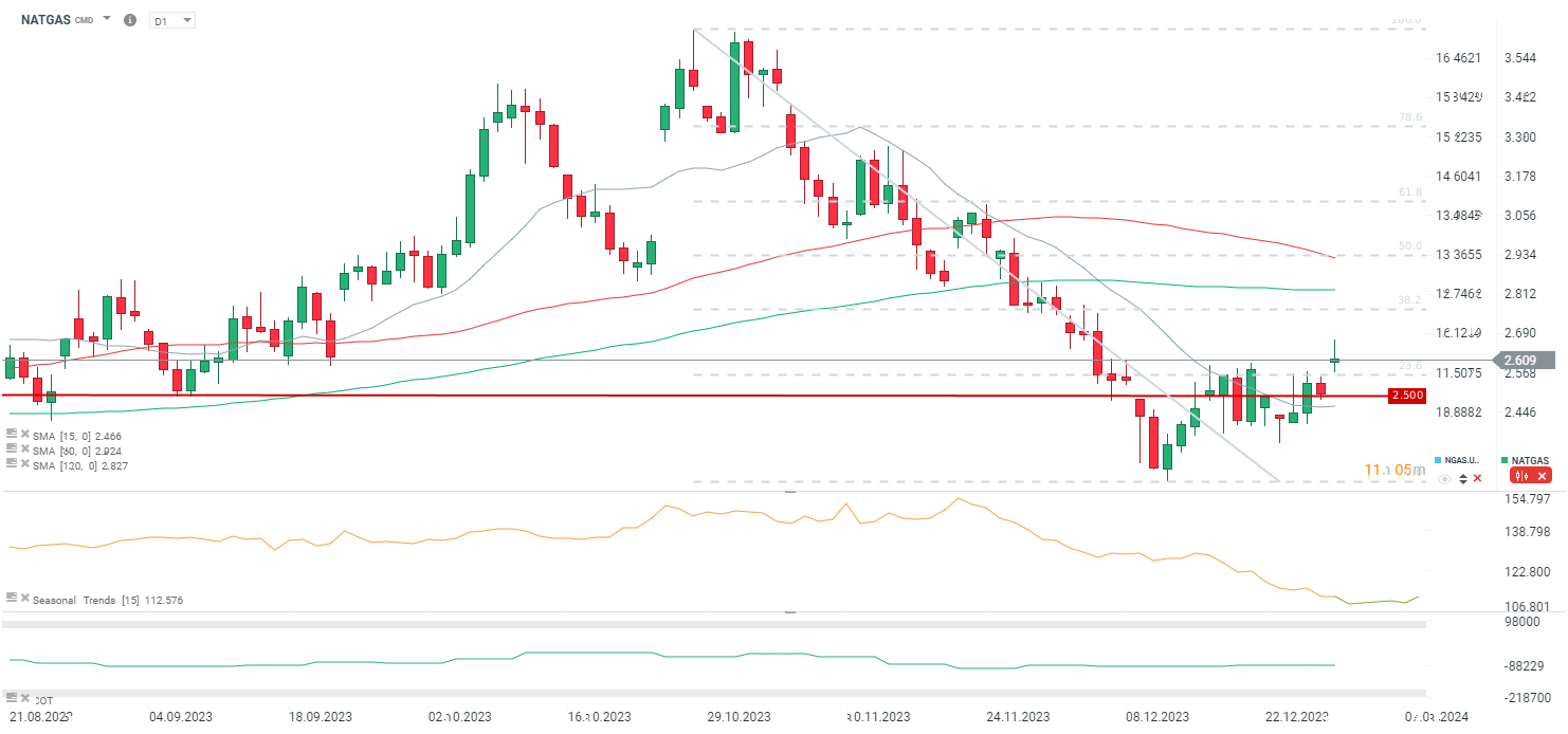 NATGAS opened the first session of the year with a bullish, upward price gap near $2.6/MMBTU. Today, the price has fallen slightly from its daily highs, but is still more than 4.5% higher from the previous close. Of course, there could be an attempt to close the gap, but the important support zone is the 23.6 Fibo retracement, where clear price reactions have been seen before.