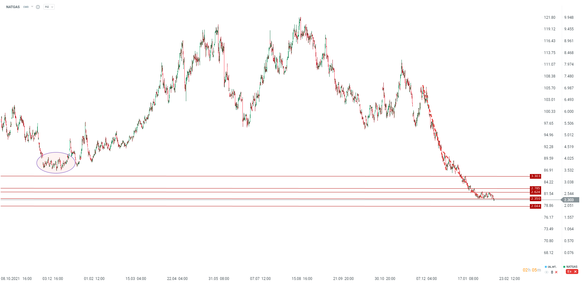 NATGAS broke below the lower limit of a trading range but remains close to it. It should be noted that historically painting a move's low during consolidation was also marked with some false, lower breakouts. Nevertheless, fundamentals remain strongly negative for prices therefore a move lower and forming a new bottom as low as in the $2 per MMBTu area cannot be ruled out. Source: xStation5