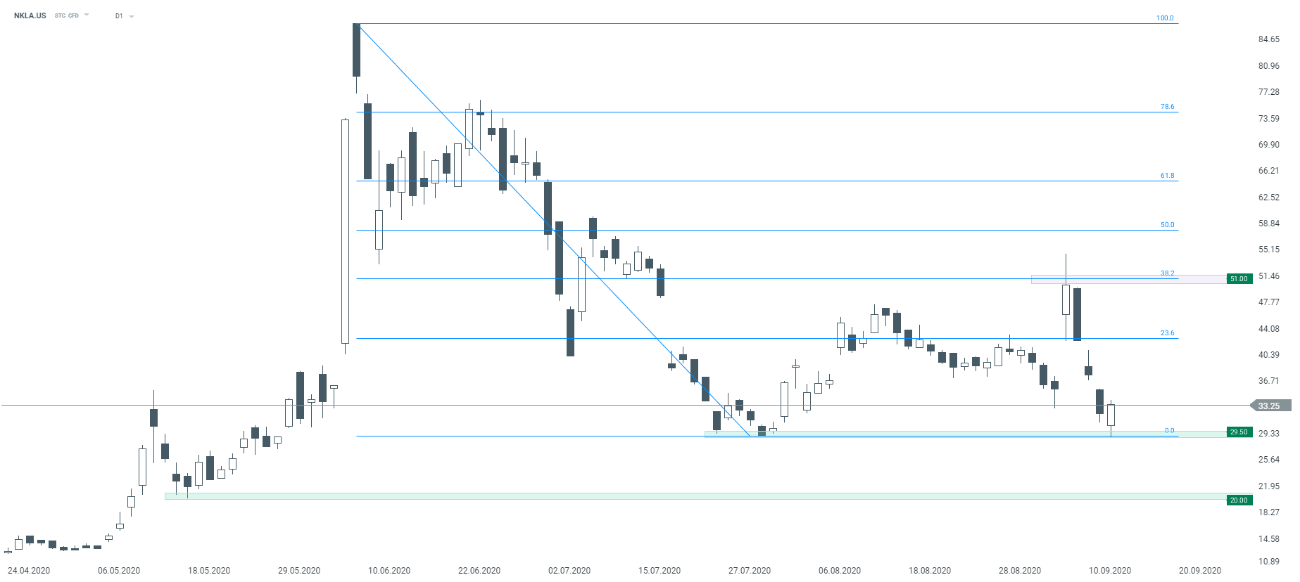 The $29.50 area turned out to be key support level as Nikola stock managed to rebound. Nevertheless investors should still be prepared for further engagement between electric-truck maker and Hindenburg Research which released its challenging report. Source: xStation5