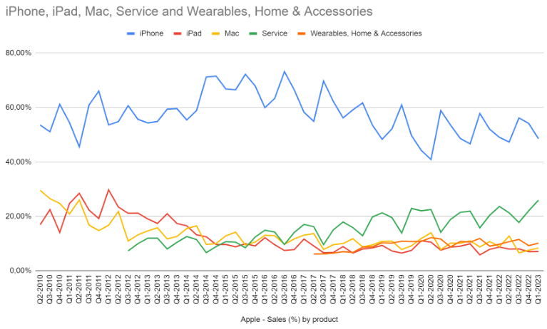 Tekintettel az új iPhone15 terminál közelgő bemutatására, lehetséges, hogy az eredmények következő bemutatásakor újabb értékesítési csúcsot fogunk látni, amely növelni fogja a reprezentativitást az összes termék tekintetében (kék vonal). Hasonlóan ahhoz, amit a korábbi években láttunk ugyanezen új termékek negyedéveiben.