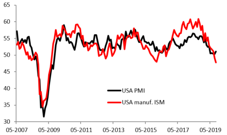 Az Egyesült Államok gazdasága már nem tud ellenállni a globális lassulásnak. Az amerikai gyártó ISM-index elérte az elmúlt évtized legalacsonyabb szintjét! Forrás: Macrobond, XTB Research