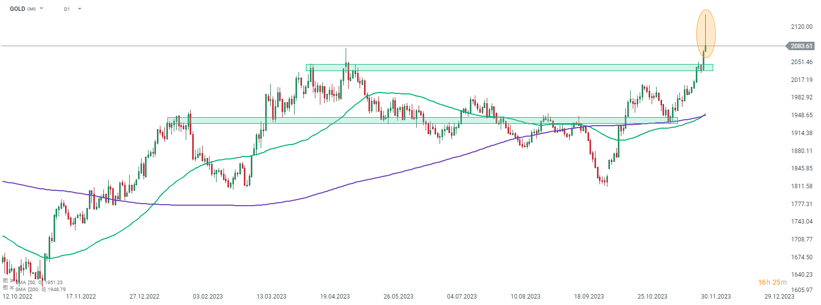 Az ARANY az új hetet magasabban indította, és unciánként 2.140 dollár körüli napközbeni csúcsra emelkedett. A nyereség nagy része azonban már el is tűnt. A közelgő kamatcsökkentések táplálják az arany raliját, az árfolyam most 8%-kal a november közepi mélypontok felett kereskedik. Forrás: xStation5